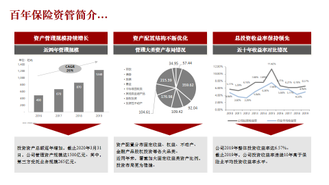 百年资管成立于2016年11月7日,截止到今年3月31日,管理资产规模1500亿,其中三方的规模265亿。在保险资金回归本源、强化资产负债管理的框架要求下,固定收益投资、权益投资、股权投资、不动产投资以及金融产品投资在资源配置以及投资管理上逐步优化。从2019年投资收益率是6.57%,我们已经连续十年的投资收益高于行业的平均水平。