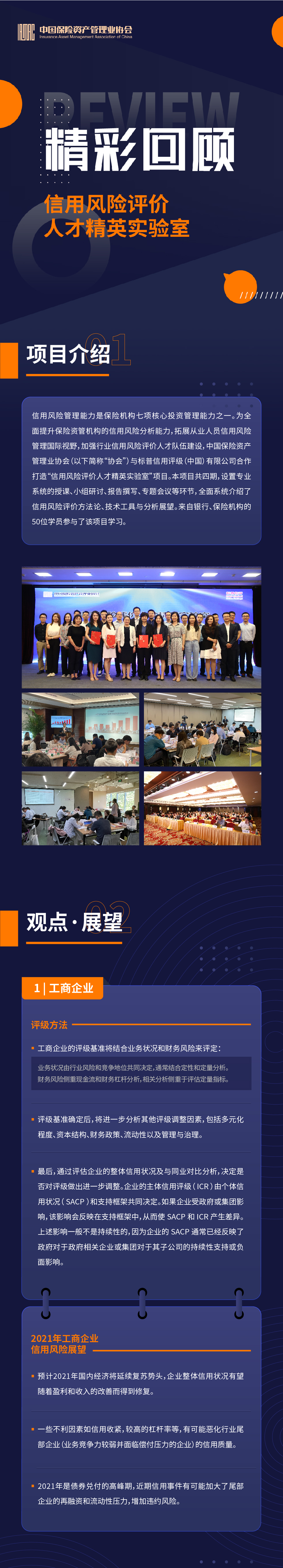 2021年,为加强行业人才队伍建设,拓展信用风险管理的国际视野,提升保险机构的信用风险识别和分析能力,中国保险资产管理业协会(以下简称“协会”)与标普信用评级(中国)有限公司合作打造了“信用风险评价人才精英实验室” (以下简称“精英实验室”)项目。该项目于7月16日完成全部四期内容学习,形成了《保险机构信用风险评价能力建设发展报告》,并于当天同步开展了“国际视角下中国信用风险评价经验探索与实践培训交流会”。协会党委委员、副秘书长张倩与标普信评总裁兼首席执行官陈红珊为本次会议致辞。会议邀请了协会信用风险专委会秘书长、新华资产副总裁兼首席风险官、合规负责人彭立志,协会自律合规部总监薛永前,精英实验室总结报告主要负责人,人保资产风险管理部法律合规部负责人胡凌斌、中英人寿资管中心信用评估部信评总监黄滨就行业实践、学习心得和报告要点进行了精彩分享。精英实验室学员以及来自保险机构、保险资产管理机构、信用评估机构等200余人参加了本次会议。
