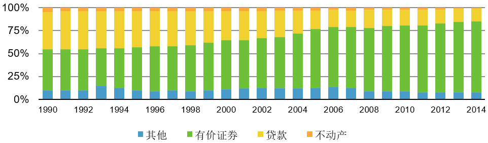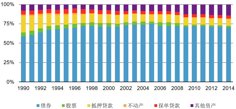 图3 美国1990-2014寿险行业主要资产投资占比