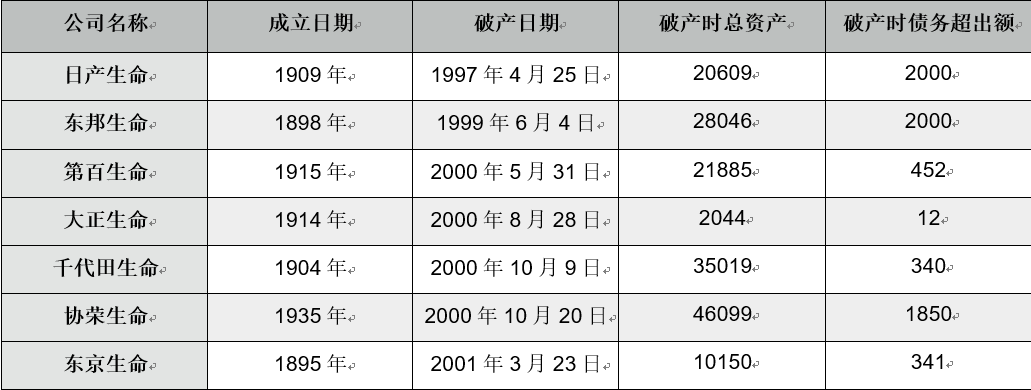 表1 1997-2001日本主要破产寿险公司(亿日元)