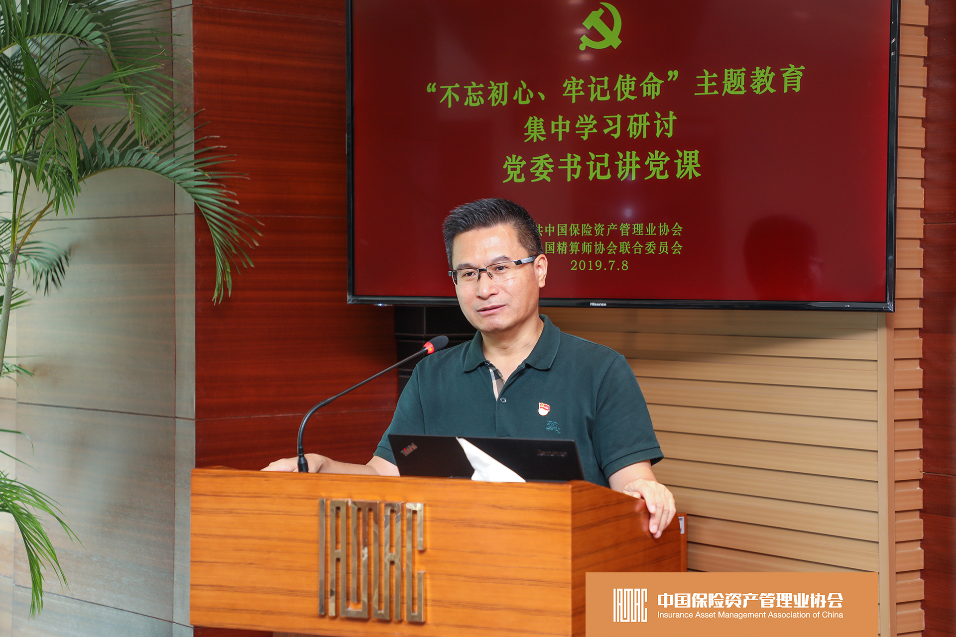 为深入贯彻落实党中央关于开展“不忘初心、牢记使命”主题教育的精神,根据中国银保监会党委的安排部署,中共中国保险资产管理业协会和中国精算师协会联合委员会(以下简称“联合党委”)研究制定了《中共中国保险资产管理业协会和中国精算师协会联合委员会“不忘初心、牢记使命”主题教育实施方案》(以下简称《实施方案》),组织开展为期两个月的“不忘初心、牢记使命”主题教育活动。根据《实施方案》安排,7月8日,联合党委书记曹德云同志为联合党委全体党员讲授了一堂生动的党课。