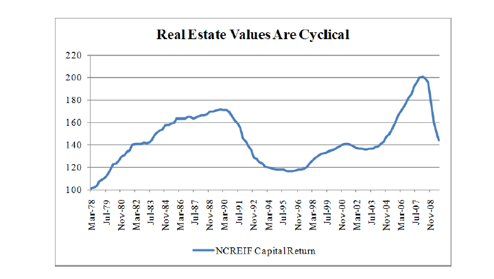 地产的周期性非常强,受市场行情、资本市场影响较大,见下图。如果波动是全球性的,那么MIT投资管理公司如何控制这种波动?地产具有非常本土化、本地化的特殊性,所以MIT投资管理公司的全球投资团队需要与当地的专家团队合作,他们更懂当地的地产,有更好的社会关系、政府关系等等,所以出了波士顿之后,就完全让地产基金经理做。