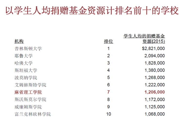 以下是2015年各个大学人均占有资源数量的排名,哈佛大学排到第三位,普林斯顿大学是人均资源最丰富的一个学校。通过本图可以看出,MIT排名第七。