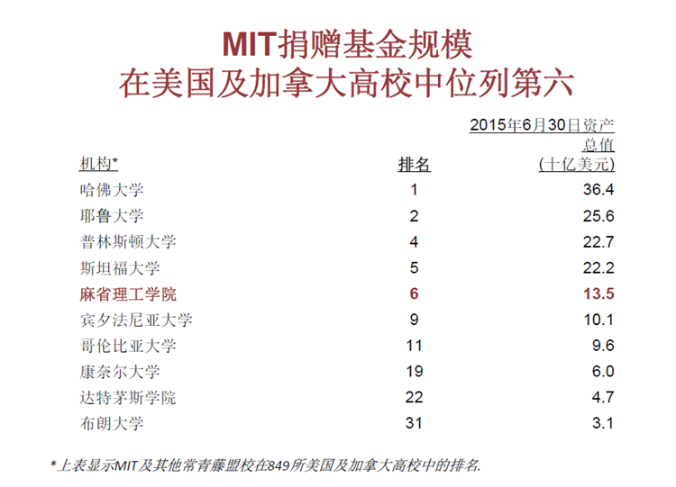 截止2015年6月30日,按照各个大学的捐赠基金资产进行排名,哈佛大学以360亿美元位居第一,历史悠久的耶鲁大学排在第二,MIT排在第六位,约130- 140亿美元,如下图所示: