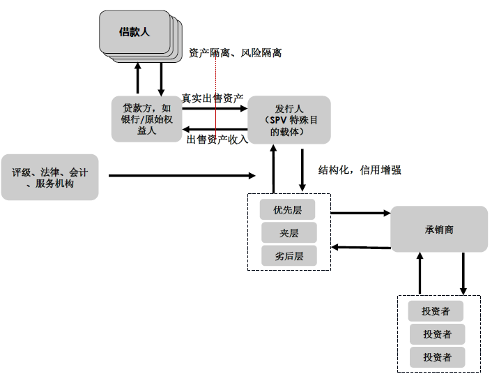 CMBS业务中参与的金融机构众多。下图是一个典型的交易结构图: