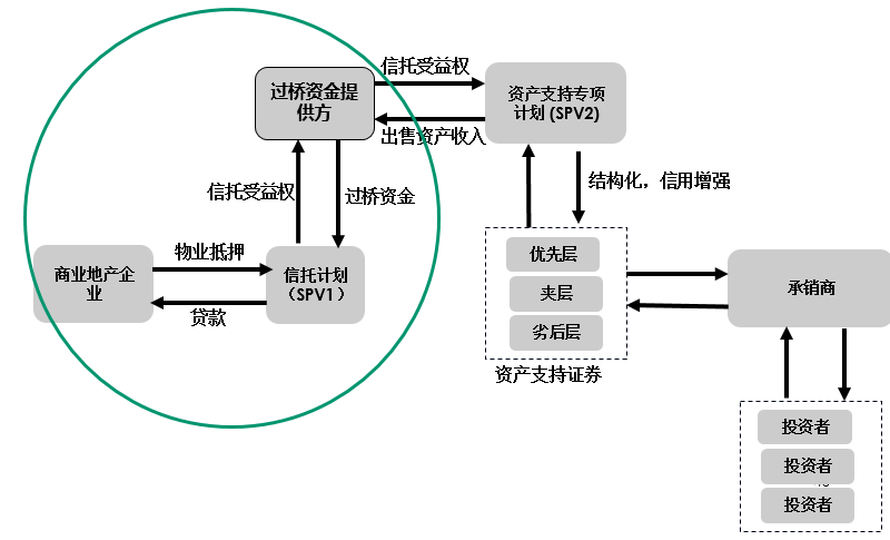 在我国,当前CMBS的发起人主要集中在两种类型:一类是具有优质现金流的物业;另一类是具有优质信用资质的主体。由于在我国,商业地产企业的主要贷款资金来源于银行,在没有银行(原始权益人)参与下,地产企业如何能利用已经抵押给银行的地产通过低成本的CMBS进行融资呢?解决方案的第一步骤是形成资产。这主要是采取以下的双SPV的方式(下图)来进行。通过母公司或者其他过桥资金提供方形成信托计划向地产企业(借款人)发放信托贷款,地产企业获得资金并向信托计划抵押地产。过桥资金提供方则成为信托计划的受益人。CMBS的基础资产由此形成,也即,基础资产为过桥资金方让与给SPV的信托受益权。资产支持专项计划通过支付对价给过桥资金方取得信托受益权,间接获取物业的未来收益。