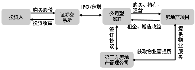 REIT是一种法定的纳税主体,但其存在的组织模式有两种。第一种的典型交易结构是公司型(如下图)。该类型的REIT是通过在资本市场公开出售公司股份来融资。投资人成为公司股东,间接持有物业资产的股份,并以股利或买卖差价的方式获得投资收益。公司型REIT既可以自己管理所拥有的地产,也可以与第三方管理公司签订协议来由外方承担地产项目的运营。