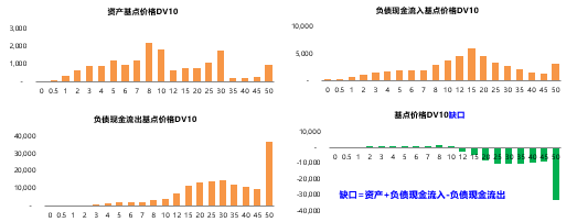 根据分布图可以看出,关键利率久期对资产较敏感的时期是在前10年,而对负债现金流入的敏感期是10-15年之间,至于负债现金流出的部分,关键利率久期在前期的负债维度很小,但在中长期比较敏感。根据这些数据,可以计算关键利率久期缺口=资产+负债现金流入-负债现金流出。结果表示,前10年的久期缺口均为正,在这段时间内,资产对利率变动的敏感程度较负债流出更为明显。10年之后到50年都是负缺口,这段期间负债对利率的变动更为敏感。该缺口数据可以用来测算在不同的利率变动情景下的资本要求。