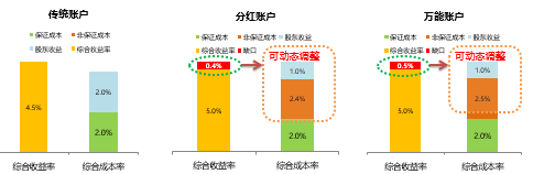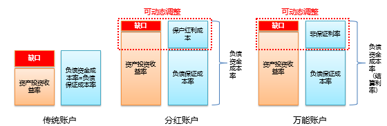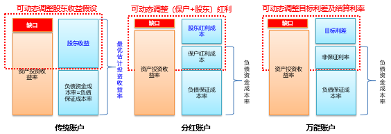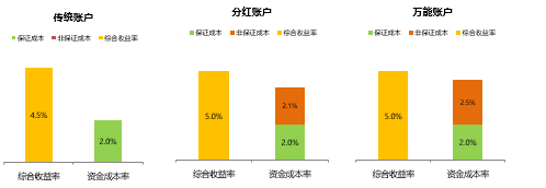 传统账户的负债资金成本与保证成本一致,一般为2%或2.5%,费改后不超过3.5%。右边是负债保证成本率,左边为资产收益率,此处会出现缺口。对于分红账户来说,负债资金成本包含保证利率与非保证利率(保户红利),将其与资产投资收益率进行比较,负债资金成本率中的保户红利成本由公司自行宣告决定,因此该部分留有一定空间,可以动态调整、核心管控。对于万能账户,其负债资金成本包括保证利率和非保证利率,这两者也即万能账户的结算利率。同样道理,结算利率的非保证利率部分也可以进行动态调整。