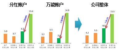 由图可见,传统账户有较大的久期缺口,分红账户缺口较小,万能账户久期为正值。公司整体综合指数是-5.8,将该数值应用在公司总体的利率风险下,若公司总资产为一千亿,则利率上升一个点,公司的资本增值58个亿;下降一个点,资本消耗58个亿。