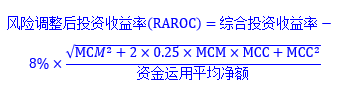 在此基础上,要对常规匹配进一步优化完善,一是资产收益率上要考虑风险调整,即风险调整后的投资收益率(简称 RAROC),要在综合投资收益率的基础上减去所占用的两方面资本影响,一是市场风险最低资本,二是信用风险最低资本,此处8%的系数是最新规则下的风险资本成本率,而欧“偿二代”为6%。