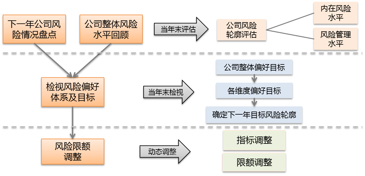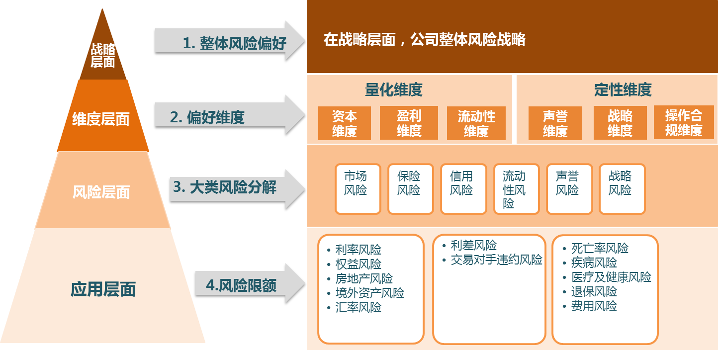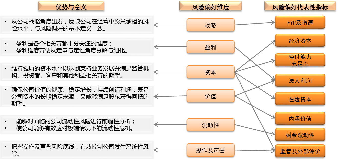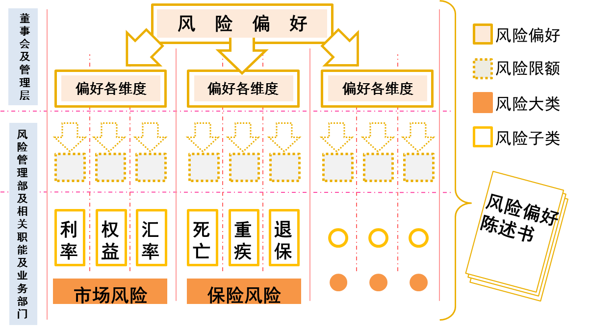 1.从外部监管来看,监管下发的《偿付能力监管规则第11号:偿付能力风险管理要求与评估》中规定,保险公司应当建立偿付能力风险偏好体系,明确公司在实现其战略目标过程中愿意并能够承担的风险水平,确定风险管理目标,运用各类有效的风险管理工具,将风险管理要求嵌入公司经营管理流程中。