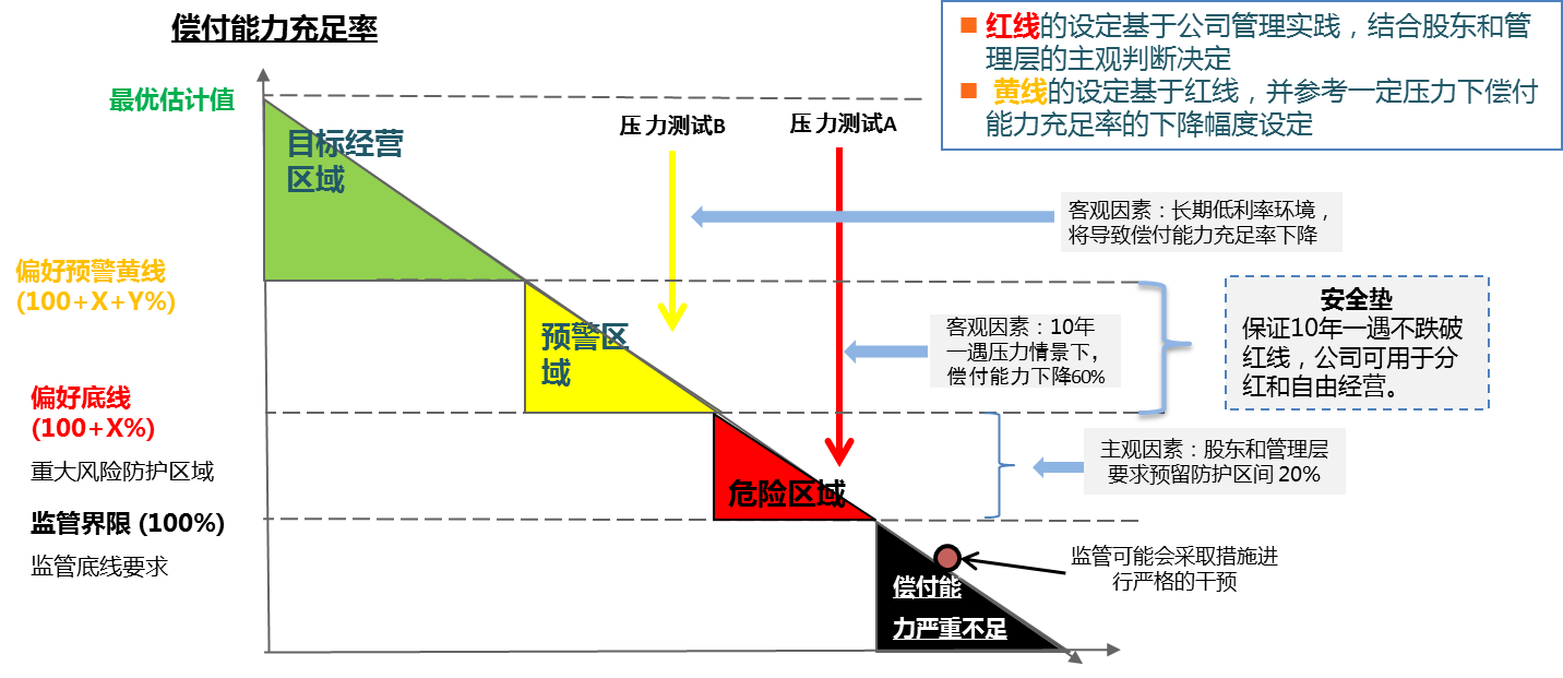 设定底线时会做一些盘点和压力测试,包括公司正常情况下偿付能力充足率测试,以及在极端低利率、负债端的贴现率锁定在一定值的情况下,是否能满足偏好底线的要求。