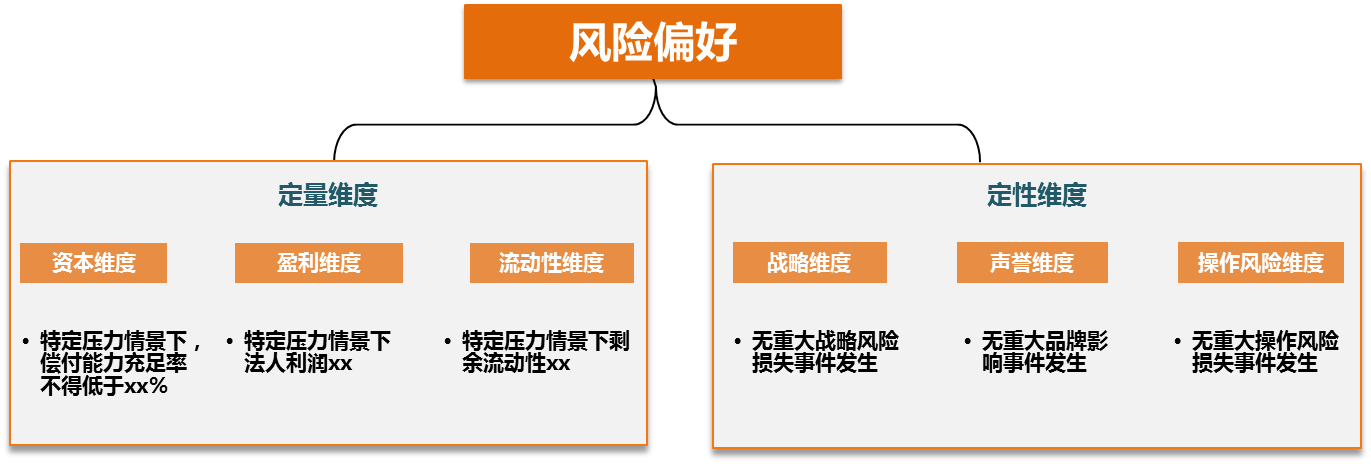 风险偏好分为定量、定性两大维度,之下分别可以有资本、盈利和流动性维度,以及战略、声誉和操作风险维度。