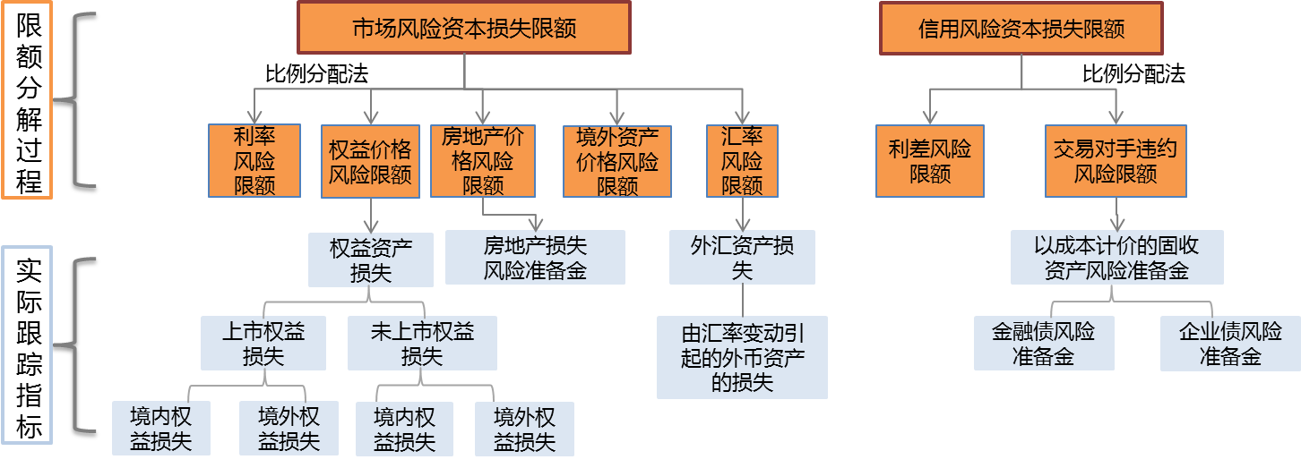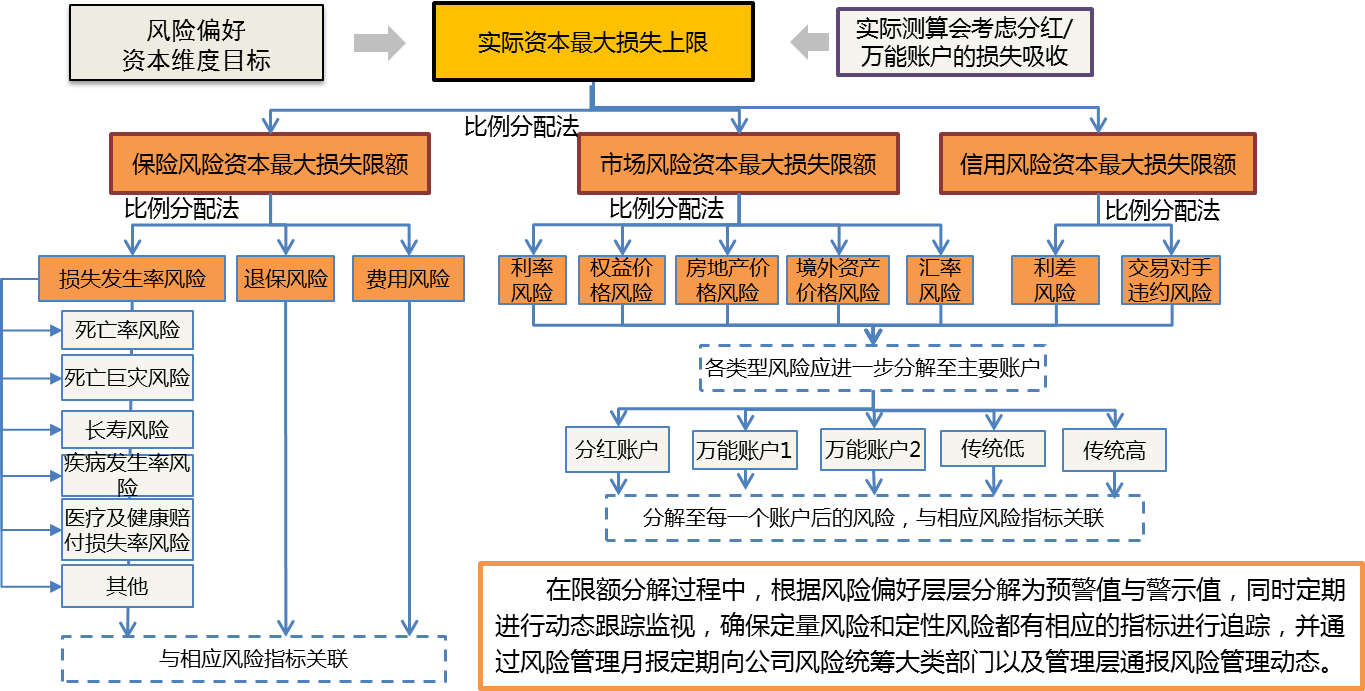 对实际资本最大损失限额进行分解,也是用比例分配法。负债端保险风险分解到各个具体的风险,资产端分解到各个资产类别,如下图: