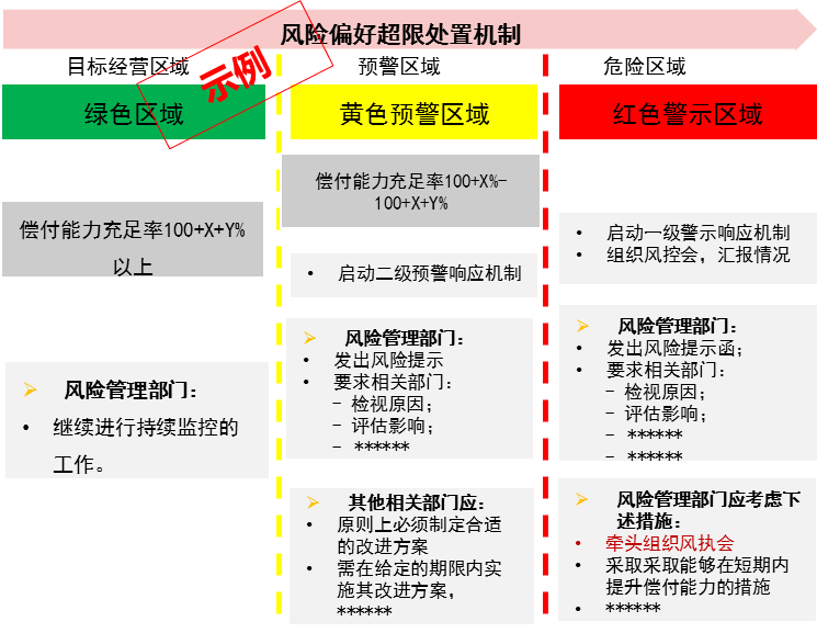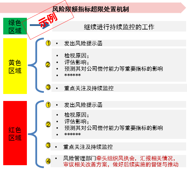 根据监测到的风险偏好、风险限额指标的不同结果,将触发不同的超限处置流程与处置措施。根据风险偏好与风险限额指标分别确定超限处置流程如下: