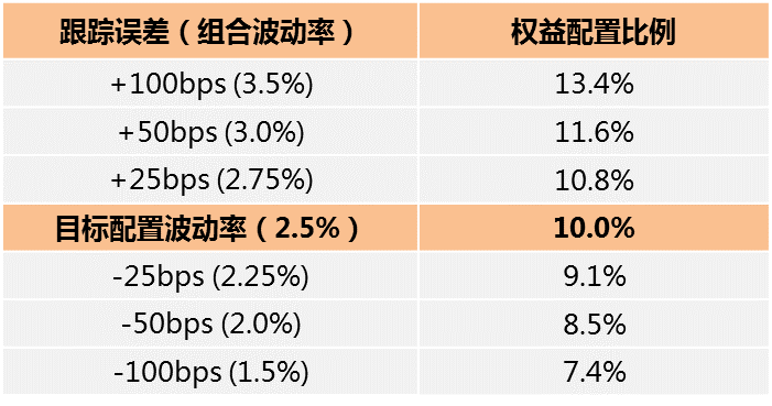 随着组合波动率的变化,负债成本的击穿概率和压力情形下的偿付能力水平都将随之变化,通过对不同跟踪误差组合的计算,选择符合公司风险偏好的权益上限。