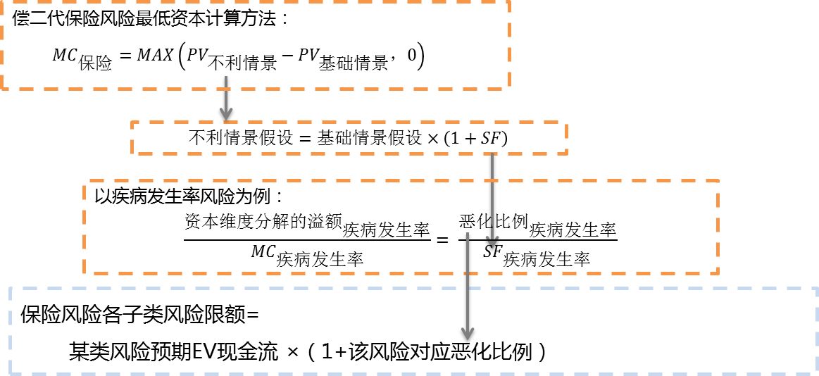 根据实践经验与公司实际业务特点,在确定保险风险限额时,可以进行一些特殊的处理:以资本维度分解而来的损失限额为基础,计算对应子类风险的经验恶化上限;最终限额为子类风险预期EV现金流+EV现金流恶化。偿二代保险风险最低资本计算方法如下: