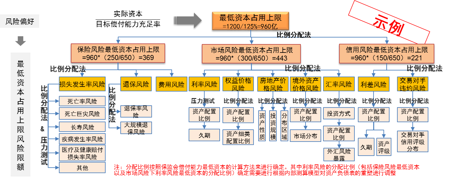 确定最低资本上限之后,按照保险风险、市场风险和信用风险的资本要求占比把它逐级往下分解。以下是一个示例: