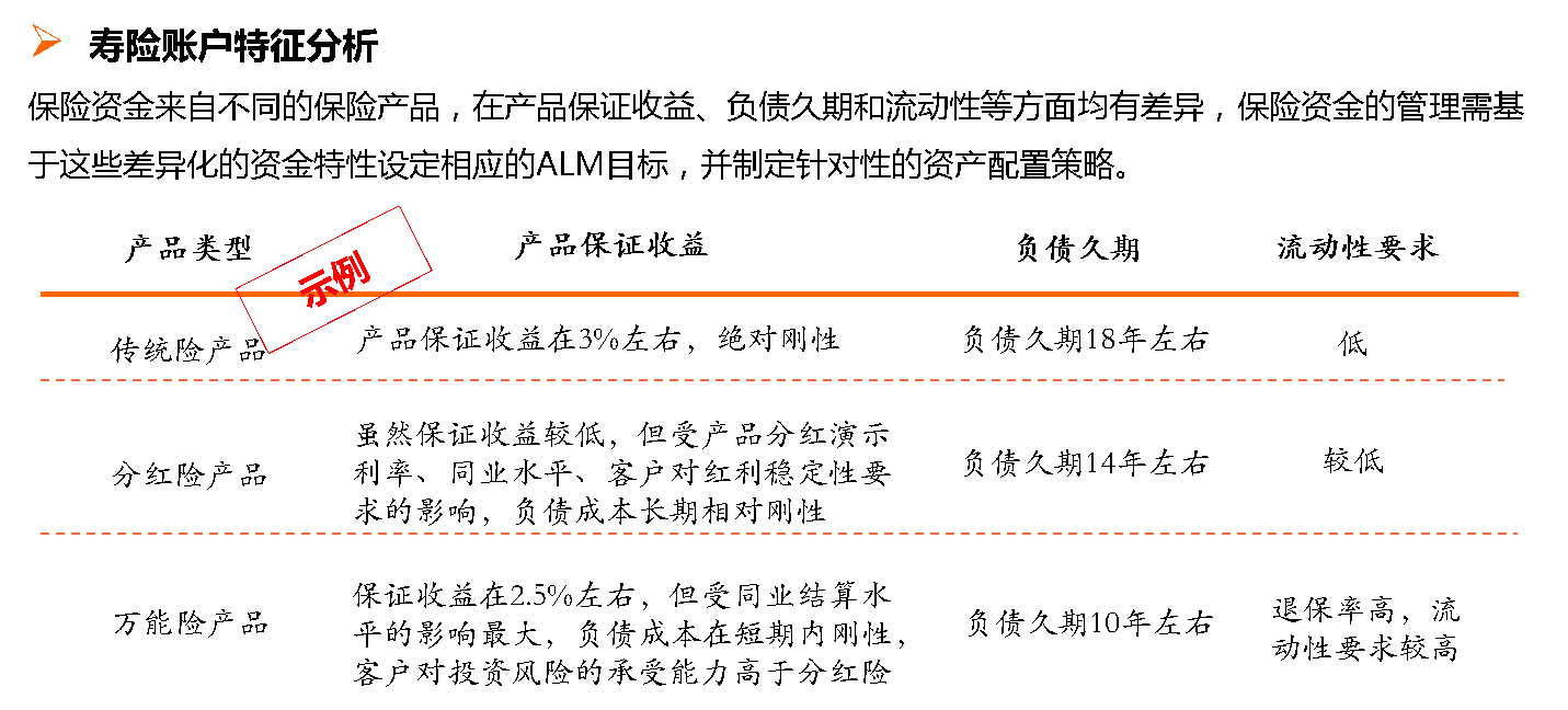 在具体操作时,会分析每个帐户的情况,传统帐户的久期特别长,分红久期比传统险帐户久期短一点,万能久期是最短的,不同的帐户对投资收益的敏感性要求不同,在做资产配置时会有不同的诉求。例如下表: