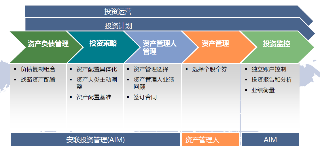 资产负债管理作为价值链的起始端,后面包括投资策略、资产管理人的管理、资产管理和资产监控。在这个价值链上,首先要了解负债端的需求,将配置组合传导到投资策略,再具体到大类配置的调整和配置基准的设置,然后转换成资产管理人的管理,在投资策略确定以后把这些标准设立到资产管理人的考核制度中。投资监控是必须的,就是因为有了每个独立帐户的设置、报表分析、业绩衡量,才能更有效地实现从资产负债管理到资产管理人管理的价值链的价值。
