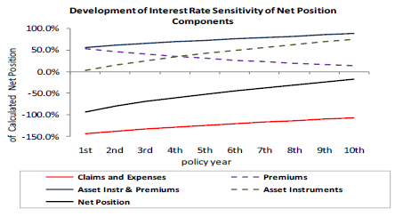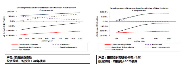(3)持续经营方法的视角:上面讲的是假设公司还没有有效业务,只有新产品。但是我们知道,一般公司都有有效业务,是不是应该在新产品开发的时候有所考虑?这也没有统一的定论,需要看各个公司不同的帐户管理,如果用持续经营的方法,那评估总帐户下的新产品利率风险是对的,因为这个公司要持续经营,但是存量账户提升久期并不容易,比如一些新进的保费,特别是存量帐户可能不多,我们必须考虑到存量帐户的一些负债端的负效应(额外分红等),同时也要注意如果一个公司的新业务不多,但存量业务特别多,那么这种情况下资产负债管理的问题还是挺多的。