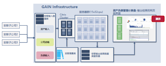 因为我们最后还是要把所有结果通过报表展现给管理层。这是随机模型搭建的集团资产管理的基础设施,所有这些都是在一个平台上面搭建的,这个平台在欧洲,所有安联子公司都会把自己的数据输入到这个平台,同时我们有一个单独的情景库,就是所谓的ESG,这种情景器同时也会输入cluster,通过服务器的运作和计算把所有的数据导入到仪表盘。