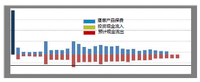 2.初始久期差的概念不清晰。期缴产品初期久期差的概念是不清晰的,因为我们不知道什么时候付保费,再就是不知道付多少。蓝色的是保费,红色的是赔付,我们可以看到净现金流包含资产现金流(首笔净保费),还有未来保费的现金流,这是对正久期的贡献。负久期就是所谓负债端的现金流,包括成本和其它现金流出,然后得出一个久期差。