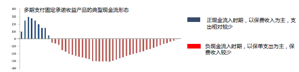 (1)从初始久期差视角:所有的多期支付和固定承诺的收益产品都会有较大的初始久期差,但也准确反映了初始阶段对利率变化的风险敞口,这些敞口证明了将来保费投入对利率风险的不确定性,也反映出后续对承保人的承诺收益无法对冲,特别是国内衍生品市场还没有得到很好开发的情况下,使用衍生品来对冲这些承诺收益还不是很完善,这是现有期缴产品资产负债管理的困境。为什么我们要说出这种不利的因素?就是因为随着现金流得以投资,它的久期差会随时间缩小,所以这不能完全代表产品预期的久期敞口。销售期后,存量业务或可以降低新业务的久期差 。