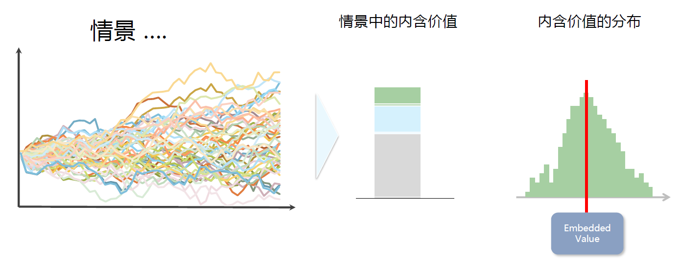 复杂的资产负债交互会导致寿险负债的评估比较慢,当分红险长期负债端随着投资回报变动而变动时,我们怎么计算内涵价值。左边是不同的情景,这些情景中的内涵价值可以通过右边绿色的分布展现出来,如果没有现有的技术,按照前面的交互平台大概需要一个多小时的时间才能评估出来。