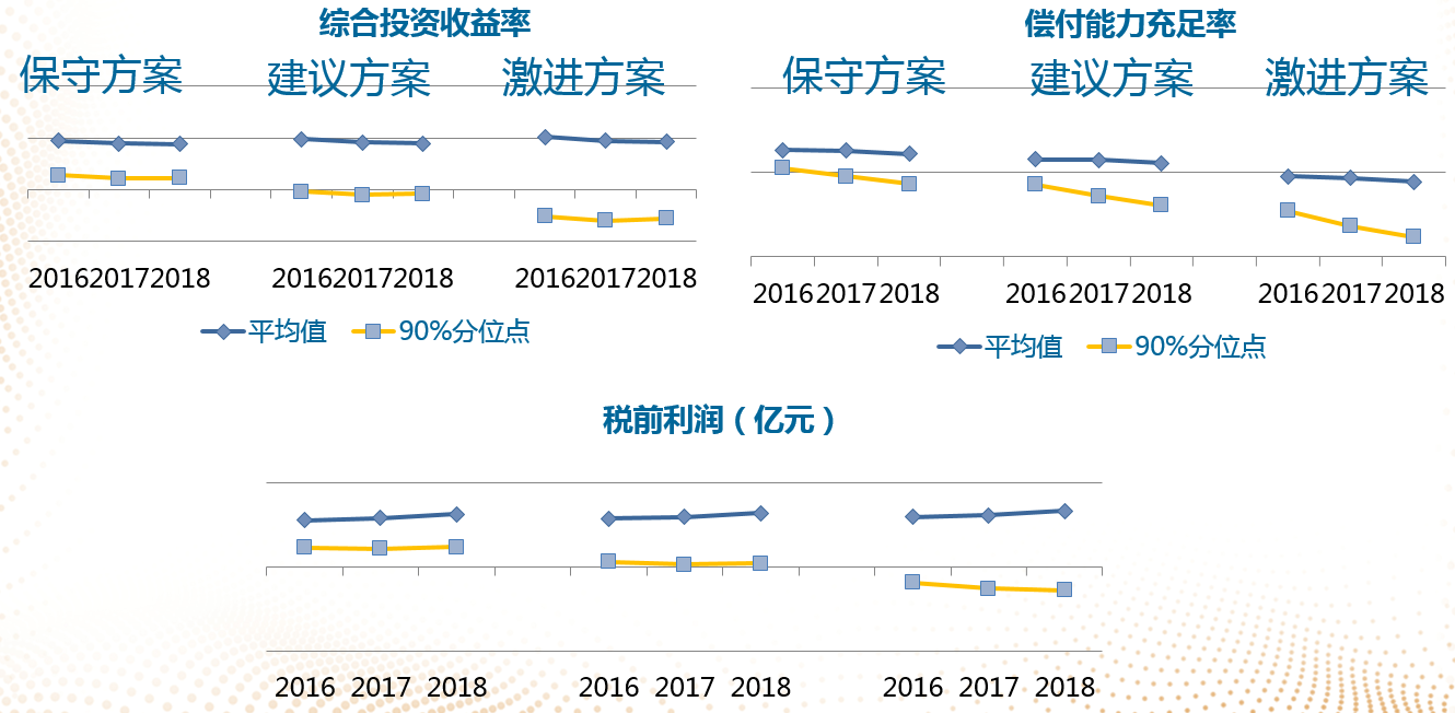 所谓的随机情景也是简化的随机,并非真的跑五千个或者五万个模型,还是估算一下平均值以及在九十分位点的三年平均收益,以及偿付能力充足率的情况,中间这条线就是打平或者可以接受的方案,由此来看不同情景下给公司带来的收益率和偿付能力充足率的变化,所以也是给管理层做决策的辅助工具。