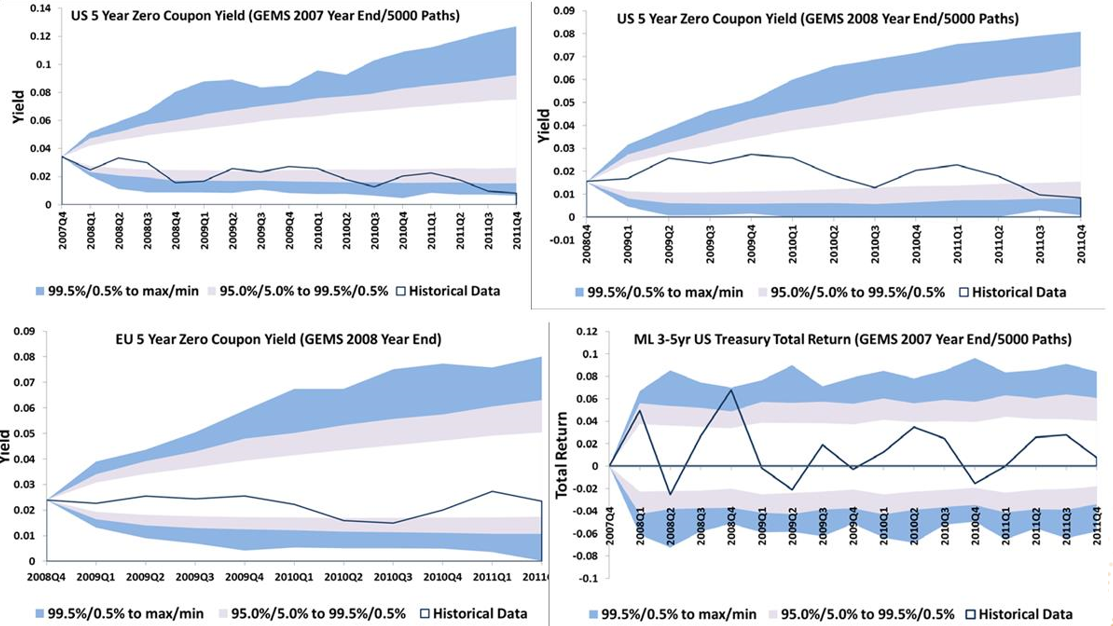 随机模型其实就是对均值方差考虑很多胖尾因素,就是把一些jump,比如股灾,放在模型中进行随机模拟,这是资产端的模拟随机事例,中间的这些值就是平均值,淡蓝色的是七十五分位点,深蓝色是九十五分位点,这样对资产未来收益的预测就是做决策的时候不仅要看平均大概能赚多少钱,也能知道赚钱的范围在什么地方,这对管理层做决策还是有很大帮助的。