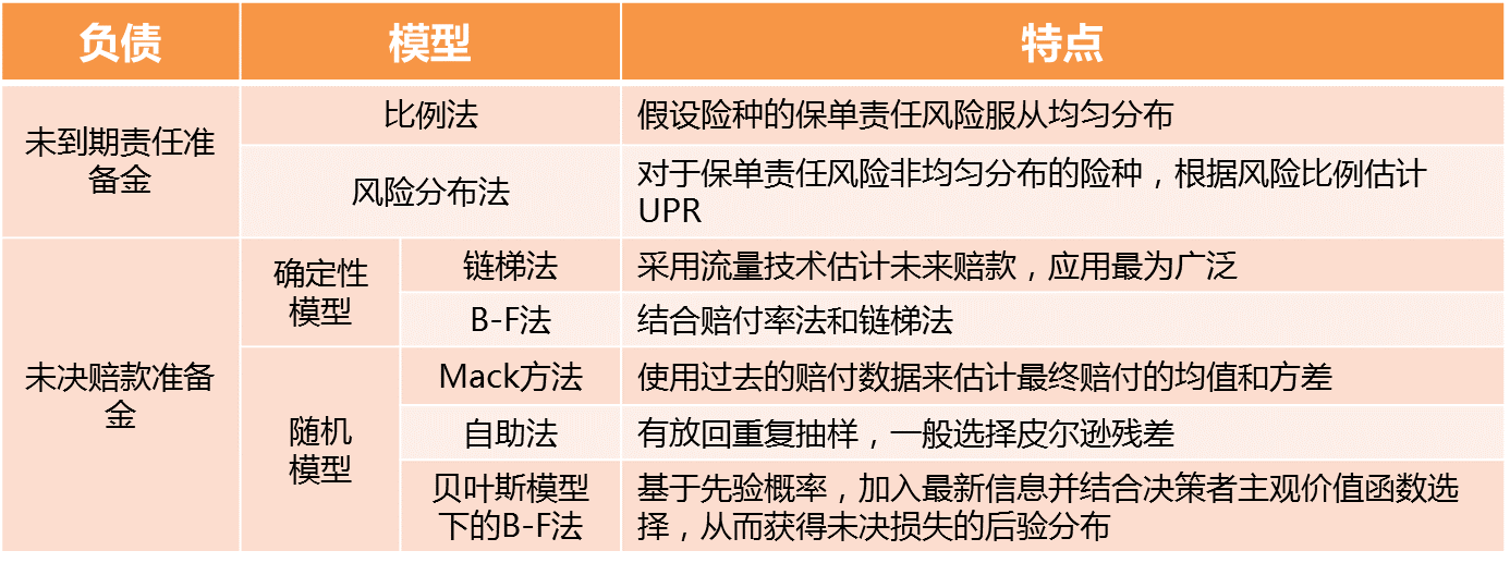 负债端传统的方法有比例法、风险分布法、链梯法、B-F法,新兴方法有随机链梯法、自助法(Bootstrapping)、Mack方法、GLM方法等。资产端模型包括Markowitz均值 -方差模型、因素模型、资本资产定价模型、Black-Litterman模型,新兴模型包括随机模型。资产负债联动的传统模型包括基于现金流匹配的ALM模型、基于久期免疫的ALM模型,新兴模型包括动态财务分析模型。