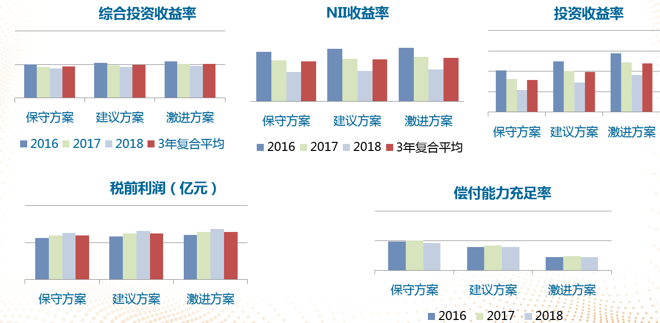 下面是针对不同情景的预测,中小公司没有办法做随机模型,可以做不同的情景方案:保守方案、建议方案和激进方案,不同的方案综合投资收益率是多少,三年平均、净资产收益率、投资收益率、税前利润以及对偿付能力的影响,激进方案就是投资收益率会这么高,从这角度来看可能挺不值的,因为收益没有增加多少,但是偿付能力充足率降了很多,从这种直观的说明可以给管理层一个比较好的决策工具,就是不是独立地看这件事情,而是要综合来看不同方案下对公司的影响。