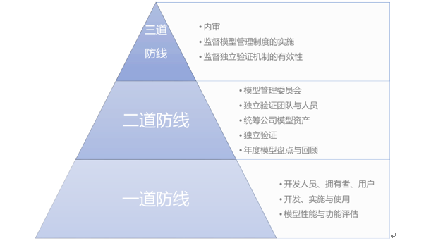 第一道防线是用户和开发人员,第二道防线是专门的模型管理委员会,同时要有独立的验证团队和人员,第三道防线就是内审,主要是看一看模型验证的制度如何才能做好。