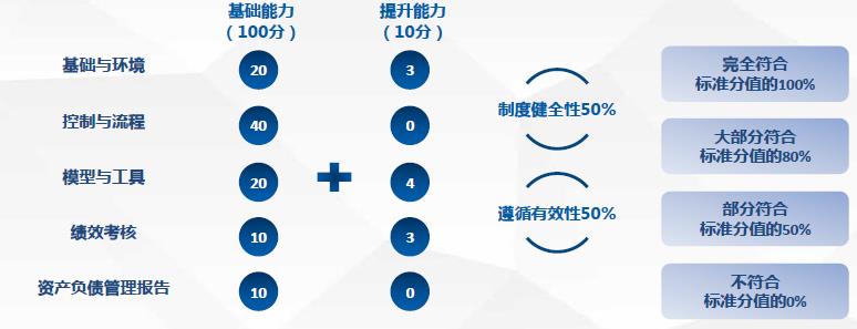 监管制度包括监管办法、量化评估规则和能力评估规则,引导公司资产负债管理工作形成有效的正反馈机制。能力评估规则分为五个部分:基础与环境、控制与流程、模型与工具、绩效考核和资产负债管理报告。评分规则如下: