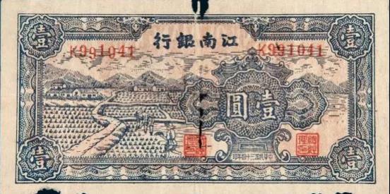 1945年5月,在苏南行署的领导下,成立了江南银行,发行了一元、五元、十元三种江南币,主要流通于苏浙皖三省交界处的长兴、安庆、广德、宜兴等地区。