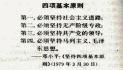 针对这些思想混乱状况,1979年3月,邓小平在党的理论工作务虚会上发表《坚持四项基本原则》的讲话。他指出,必须在思想上政治上坚持社会主义道路、坚持无产阶级专政(后表述为人民民主专政)、坚持共产党的领导、坚持马列主义毛泽东思想这四项基本原则。