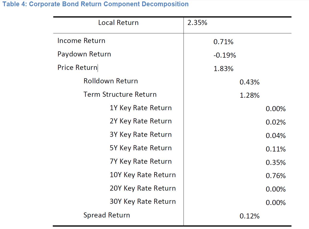 3.价差收益率(Spread return),这里讲的比较多的就是净利差,不同的等级就会有不同的定价标准。AAA标准跟A标准肯定是不一样的。