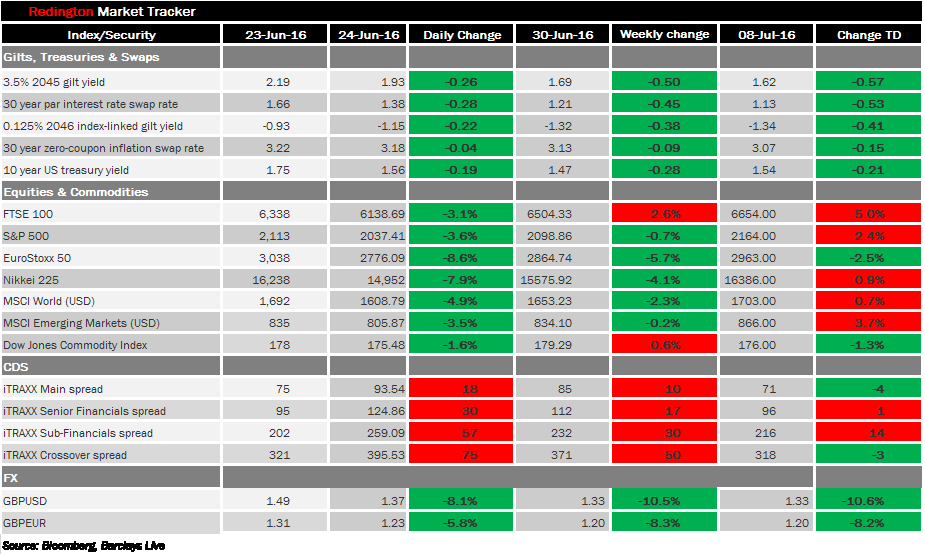 随着事态发展以及各国政府和央行的表态,市场开始慢慢消化英国脱欧的影响。从英国股市来看,由于英国主要股指FTSE100中成分股出要由大型跨国公司组成,其业务范围有全球化的特点,收入来源分散化明显,因此受影响不大。对于一些能源类和出口型企业来说,英镑的贬值甚至是好消息。而随后不久,为了应对脱欧可能对英国经济造成的影响,英国央行表态会为市场提供充足的流动性,必要时会考虑降息,相应的,英国财政大臣George Osborne也表示将下调企业税率。在这两个重大利好的影响下,英国股市一路收复失地,截止昨天,FTSE100收盘已经相比脱欧前的指数水平上涨了5%,市场大有由Risk off向Risk on的转变之势。