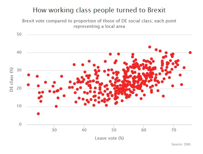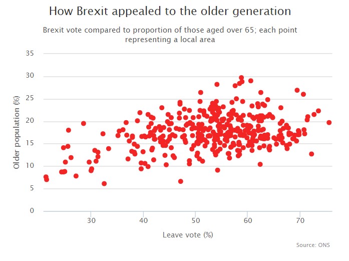 除了地区性的分裂之外,以年龄和受教育程度的不同,投票的倾向也非常不同。根据英国国家统计局的估算(虽然相关性并非十分明显),年青人和受教育程度相对较高的人群大部分选择留在欧盟,而老年人和受教育程度相对较低的群体大部分选择脱离欧盟。但是年青人的整体投票参与度很低,所以导致年青人的选票在整体比例上远小于中老年人。另外的统计数据也显示,在更专业的工作岗位上的人倾向于留在欧盟,而生活水平相对较低的人群投了脱欧票。