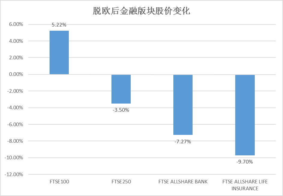 然而,虽然股指整体上涨,各板块间的分化却非常明显。由于脱欧事件最直接影响到的是伦敦金融城未来的地位以及驻扎在伦敦的主要金融机构未来承接欧洲业务的能力,加上未来监管的不确定性,银行、保险和地产行业还是受到了严重冲击。