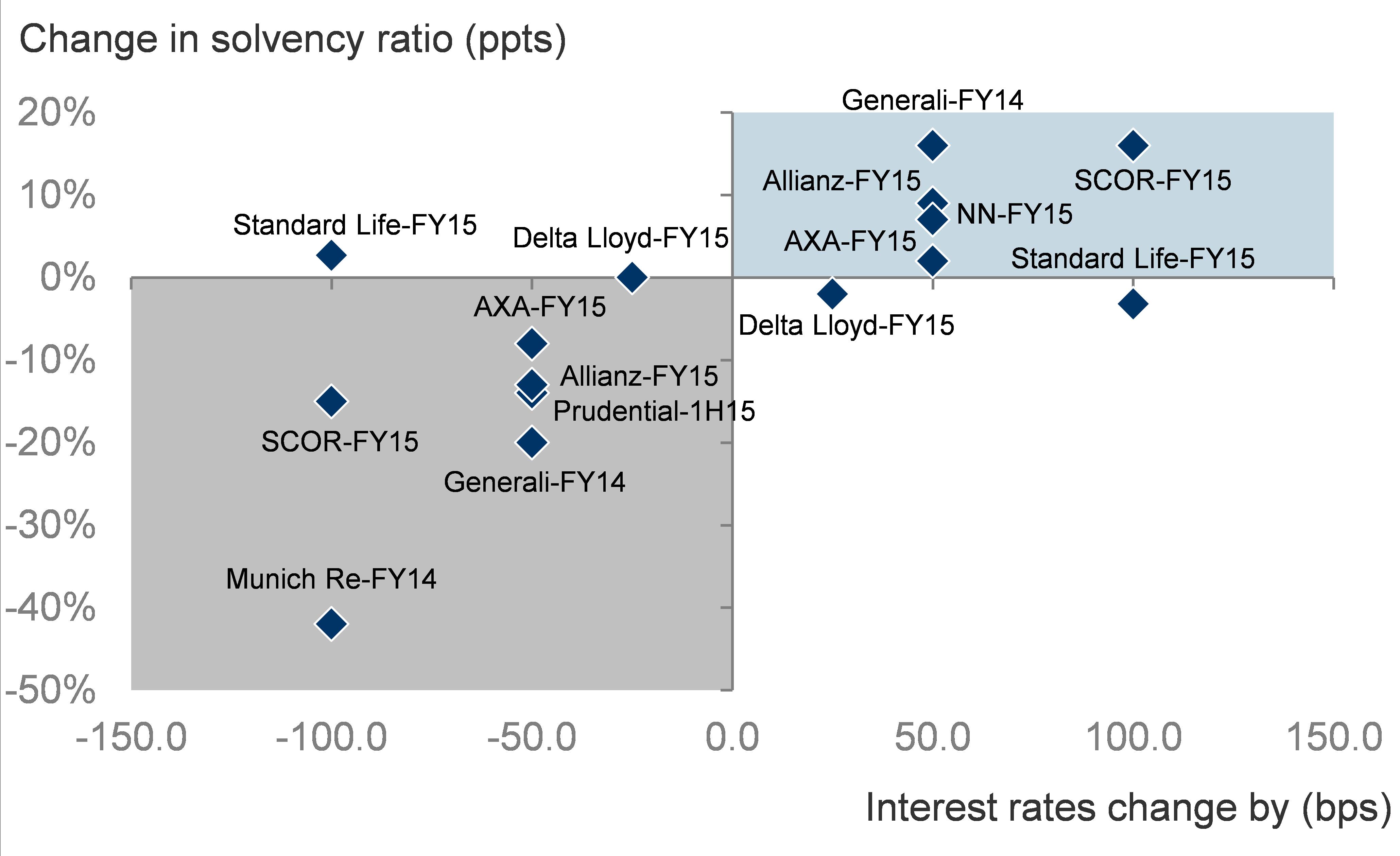 第三,长期的低利率环境会给保险公司带来再投资风险。也就是说,在资产到期进行再投资时,投资回报率不能达到之前所预期的回报甚至保险公司的负债端成本,因此会产生比较严重的利差损。以下两个图来自于Morgan Stanley的保险研究分析,可以看出在利率下降或者持续低利率环境的情况下,欧洲一些主要的保险公司的盈利能力与偿付能力充足率都会受到很大的影响。