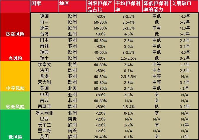 我们需要了解在现有的经济环境下,保险公司的产品盈利能力是否会受到影响,是否能够不断地研发新的产品来满足客户的需求。由于各国寿险公司在产品设计中都存在一定的利率担保,因此联系到上文阐述的低利率环境所带来的再投资风险以及利差损的影响,这些对保险公司来说都是相当不利的。当然,具体影响取决于各公司利率担保产品的占比,平均担保利率水平以及对担保利率调整的灵活性。此前,穆迪做了一个对各国利率担保产品的一个研究报告(如下表),可以看出在欧洲、德国、荷兰以及北欧的一些国家,利率担保产品占比以及担保利率水平都比较高,并且欠缺调整担保利率的灵活性,因此会受到低利率环境更大的影响。相反,英国利率担保产品较少,担保利率也较低,因此受低利率环境的影响也相比较小。