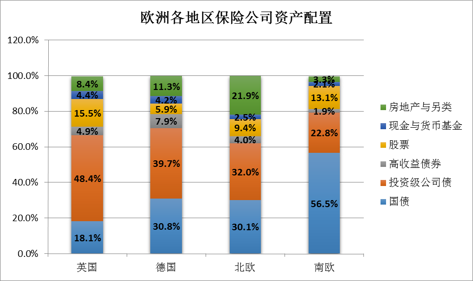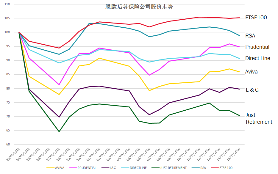 因此,对于保险公司来说,这些趋势不但会对各大类资产造成不同程度的估值压力,并且会影响保险公司的投资收益、盈利能力、资本充足率以及估值水平。当然,具体影响取决于各保险公司的资产配置、投资风险管理水平以及杠杆比率、偿付能力充足率等等。例如,寿险公司与非寿险公司相比,业务期限一般比较长,对股票、房地产以及其他风险资产的配置更高,因此在投资端所受到的影响也会远远高于非寿险公司,这从近期的一些股价也可以反映出来(下图的Direct Line Group和RSA均为非寿险公司)。此外,英国的保险公司在风险资产配置上平均来讲要高于德国以及一些南欧国家,因此受到的影响也会偏大。而全球运营的保险公司不但业务上更加多元化,同时在资产配置上也更加分散,更加灵活,因此他们受到的影响也会小于单一国家和市场经营的保险公司(下图的Aviva, Prudential和Legal & General为英国前三大保险公司,以寿险业务为主,并且全球性运营,其中Prudential的全球化做得最好,因此股价受到的影响也最小。JustRetirement Group为英国本土运营的以年金业务为主的保险公司,股价受到的影响偏大)。