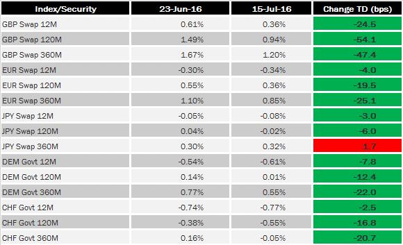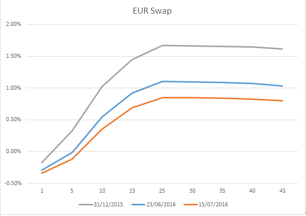 我们再来看看一些具体的数据,下表显示的是几个发达国家在退欧公投之前(6月23号)与退欧后(7月15号)的短期与长期利率水平。可以看到,在上周五截止的时候,英国10年利率为0.9%,30年利率1.2%;欧元区10年利率互换为0.4%,30年利率为0.9%;德国10年国债收益率已经下降到了0%(之前有过负利率),30年国债收益率0.55%;最后,瑞士的情况最特殊,从1个月到50年的国债,收益率全部为负数,尤其是退欧事件发生之后,30年与50年的国债收益率都变负了,非常不可思议。这就是资本市场,变化莫测,永远无法预测下一步会发生什么。曾经在金融危机之前,没有任何人相信会出现负利率,结果金融危机之后就发生了。后来没有任何人相信长期利率会变负数,结果现在也发生了。曾经很多人都认为利率会均值回归,回归到历史的平均水平(对于许多发达国家来说就是4%-5%),可是十几年过去了,利率不但没有回归,反而越走越低,突破了人们所认为的底线。