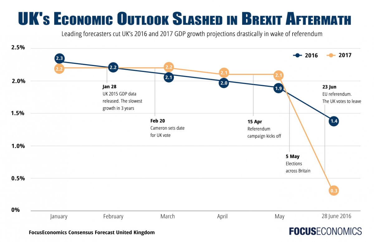此外,尽管英国退欧的正面与负面影响同时存在,但总体预期,退欧对英国经济的整体影响还是偏负面的,至少短期内我们这么预测。许多相关的经济报告都有表明,英国退出欧盟会导致英国未来几年的GDP下降1%-2.5%左右。