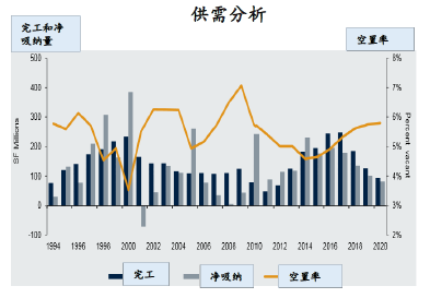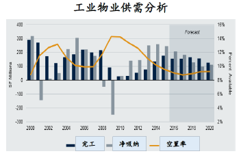 再一个我们看工业市场的分析,该图租金增长和空置率的关系。租金从2012年开始持续上涨,空置率从2010年开始一直下降,我们预期租金还是会继续保持逐年上涨,空置率继续下降,因为供应的关系,2017年左右会放缓。