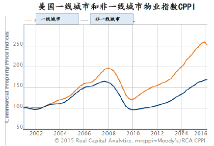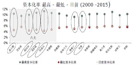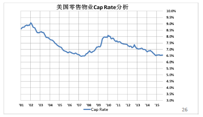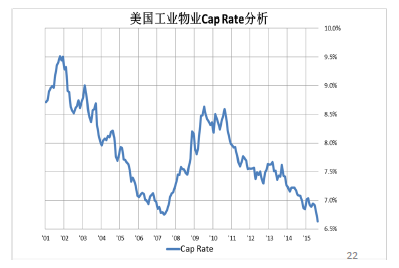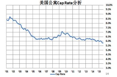 这张图比较有意思,从2000年到2015年,这是绝大多数美国城市资本化率的一个分布。从高点到低点,划横线是目前资本化率,所有主要城市在资本化率长周期的底部,说明现在美国房地产是在价格非常高的区间。