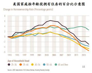 如图所示,每一个颜色代表一个年龄区间,如果以1993年作为一个起点来算,到目前为止每个家庭拥有住房的百分比,我们可以发现只有一个年龄段,在现在住房拥有住房百分比高于1993年,在64岁以上的人群。所有从25-64岁全部拥有住房比例是低于1993年的水平的。